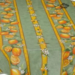 58″ Round Calisson Cream & Green Allover Acrylic-Coated Cotton Tablecloth By Tissus Toselli