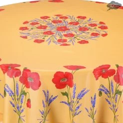 70″ Square Poppies Yellow Acrylic-Coated Cotton Tablecloth By Tissus Toselli