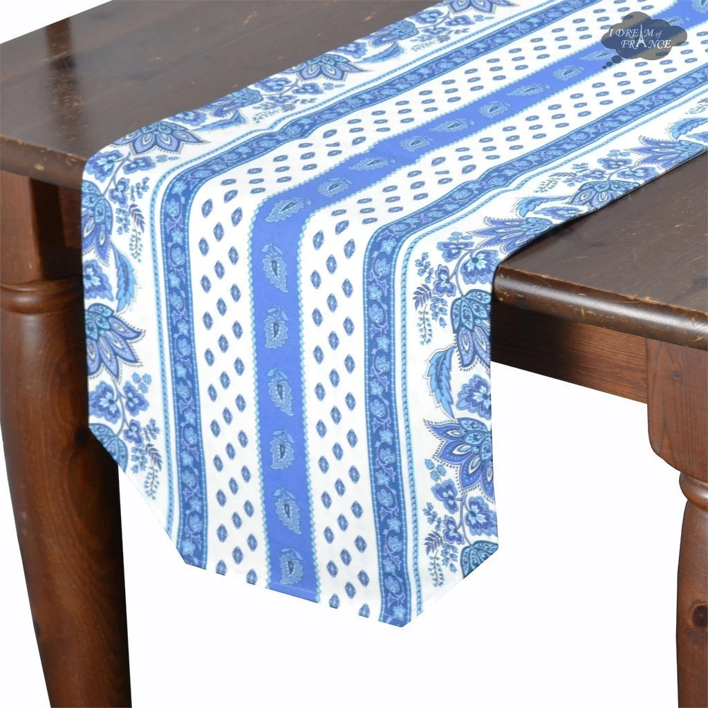 From Le Cluny French Country Collection, this coated table runner will transport your table to the French countryside. It blue features flowers on a white background. It is 100% cotton coated with acrylic to make it stain resistant and long lasting. Spills will not go through, protecting your table. Cleanup is as easy as wiping it with a sponge. UV resistant, they will not fade and are perfect inside or outside.
