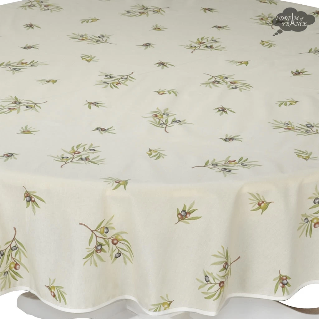 From L’ensoleillade, this tablecloth features abright and cheerful all-over pattern with olive brancheson alight cream background. It is 100% cotton and is available with or without stain resistant coating.With the optional acrylic coating,spills will not go through, protecting your table. Cleanup is as easy as wiping it with a sponge. UV resistant, they resist fadingand are perfect inside or outside.