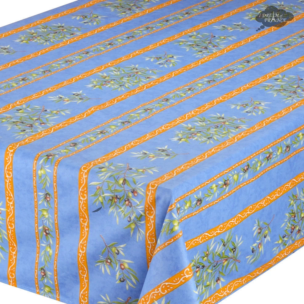 From Provence, this coatedtablecloth features bright and cheerful olive brancheson a blue background. It is 100% cotton coated with acrylicto makeit stain resistant and long lasting. Spills will not go through, protecting your table. Cleanup is as easy as wiping it with a sponge. UV resistant, they resist fadingand are perfect inside or outside.