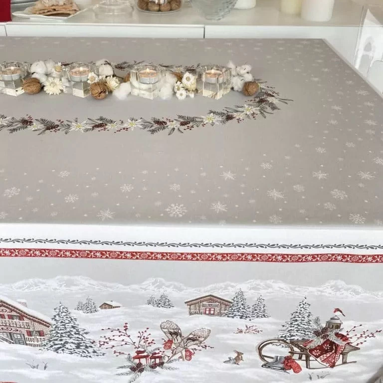 FromTissus Toselli, thiscoated cotton tablecloth is a perfect addition to your Christmas dcor!TheSnow Trektablecloth featuresaa snow covered landscape lined with pine trees, snow cabins, skis, toboggan sled, squirrel and more.It is 100% cotton coated with acrylicto makeit stain resistant and long lasting. Spills will not go through, protecting your table. Cleanup is as easy as wiping it with a sponge. UV resistant, they resist fadingand are perfect inside or outside.