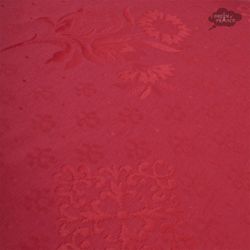 FromTissus Toselli, this matelass tablecloth features a bright and cheerfulPoppies Yellowborderon a patterned red background center. It is 60% cotton and 40% polyester.Made on a jacquard loom,the center fabric is thick and soft andhas a raised pattern that gives ita quilted look. The border is sewn around and is the same fabric used on other products of thePoppies Yellow line.