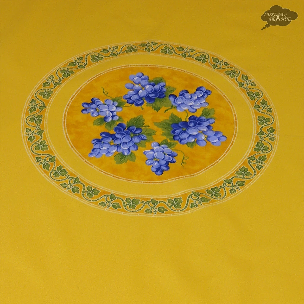 70″ Round Grapes Yellow Acrylic-Coated Cotton Provence Tablecloth By Le Cluny