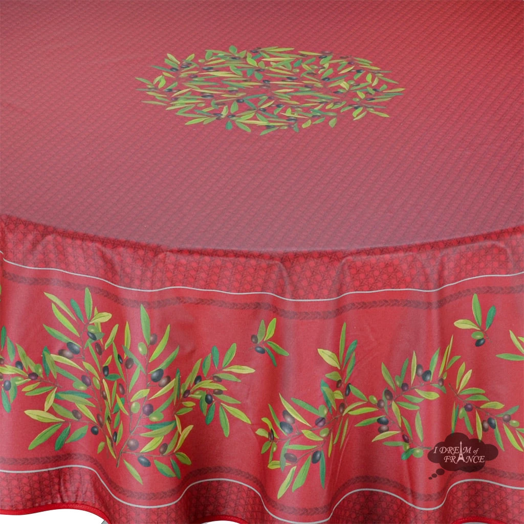 From Tissus Toselli, this tablecloth is named after the picturesque town of Nyonsin the heart of Provence. It features a bright and cheerful olives motif on a dark redbackground with a woven cane rattan pattern. It is 100% cotton and is available with or without stain resistant coating.With the optional acrylic coating, spills will not go through, protecting your table. Cleanup is as easy as wiping it with a sponge.UV resistant, they resist fading and are perfect inside or outside.