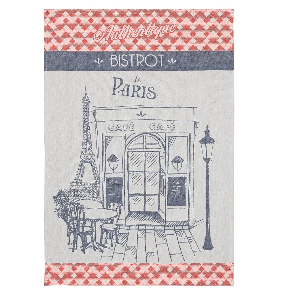 TheBistrotAuthentique(Authentic Bistro)jacquard dish towel from Coucke will brighten your kitchen and your day. This blue and red towel measures 20″ x 30″ and features a detailed illustration of a French caf, bistro table and chairs and the Eiffel Tower in blue on a graybackground with red plaid accents. Beautiful and soft, this towel will serve you well.