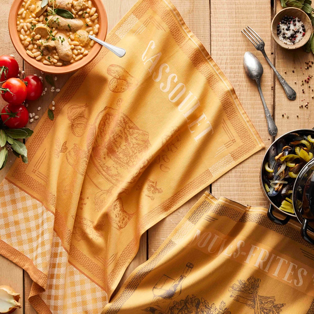 TheCassouletjacquard dish towel fromCouckewill brighten your kitchen and your day. Thismustard color teatowel measures 20″ x 30″ and features a detailed illustration woven into the towel of the traditional French bean and meats stew. Beautiful and soft, this towel will serve you well.