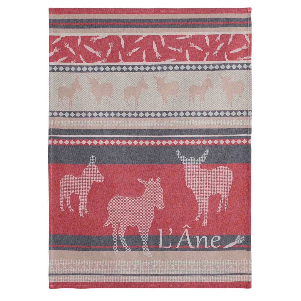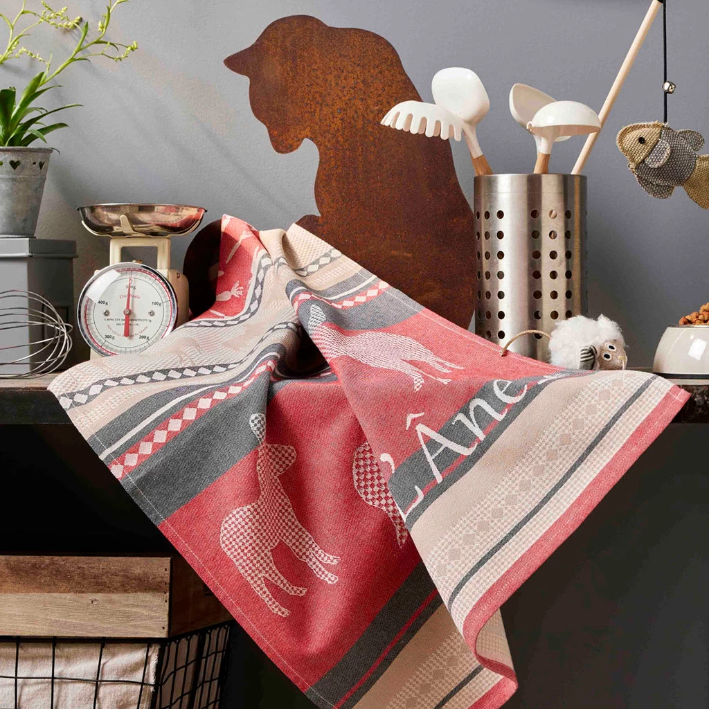 TheAnes(Donkeys)jacquard dish towel fromCouckewill brighten your kitchen and your day. Thisred, black and taupetea towel measures 20″ x 30″ and features a detailed illustration woven into the towel of donkeys and carrots. Beautiful and soft, this towel will serve you well.