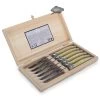This set of 6tableknives is a prime example of the Laguiole tradition. These superior quality knives adorn the traditional bee, theblades are extra thickstainless steel (2.5mm or .1″) with beautifulblack acrylic handles. These knives can be sharpened over and over and will last for many years to come.The back of the handles are hand engraved.The six knives come in an atractive wooden box.