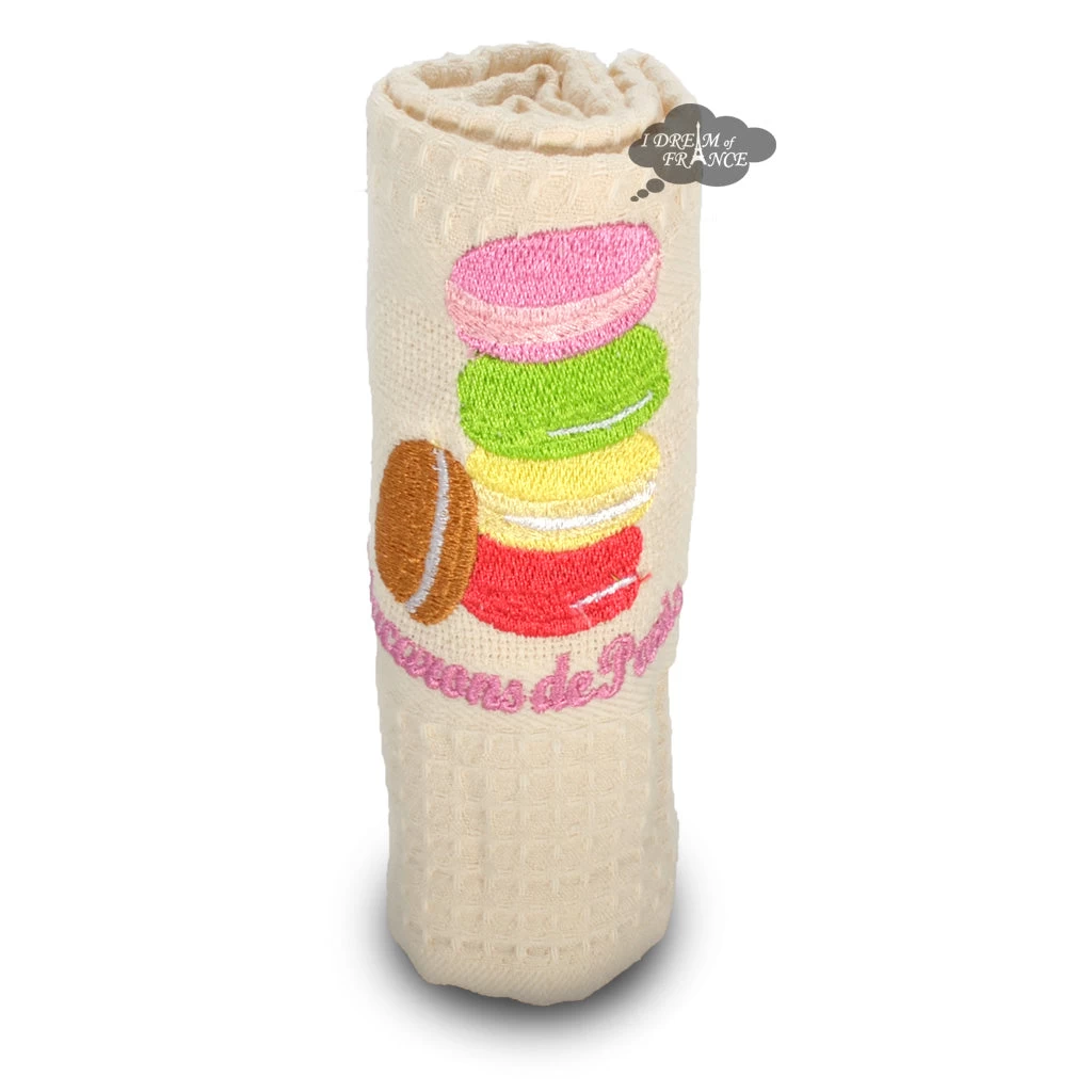 Direct from France, this beautiful towel will be a great addition to your kitchen. Made of 100% cotton, this Coton Blanc towel will handle the toughest jobs thanks to its waffle-weave texture. This creamcolor towel is embroidered withan stack of macarons and thewords Macarons de Paris. It comes rolled as on the first picture, perfect for offering as a gift.