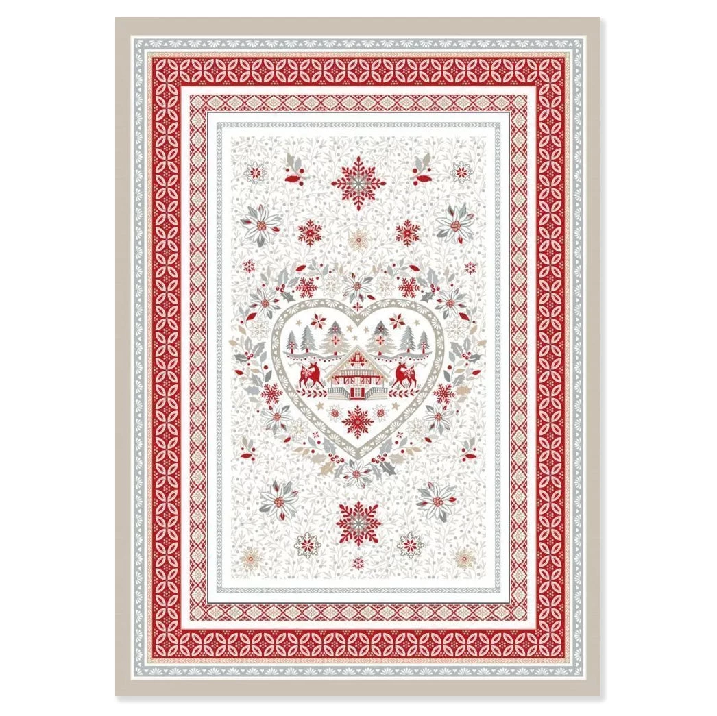 FromTissus Toselli, this cotton tea towel is a perfect addition to your Christmas dcor!The Mistletoetowel featuresa beautiful Christmas display with a heart in the center with a winter chalet and dears on the inside and mistletoe, snow flakes and other Christmas decorations surrounding it.This towel measures 20×27″. Sold individually.