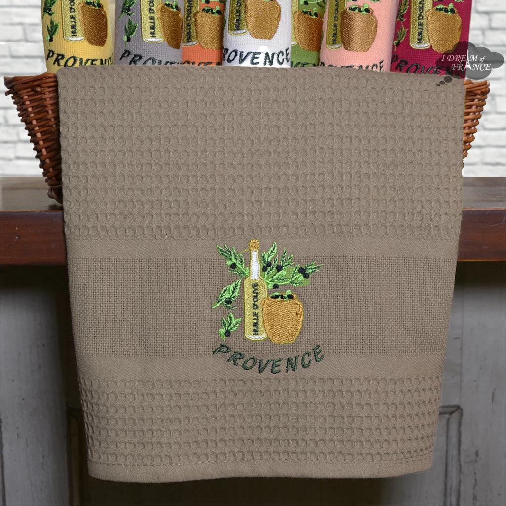 Direct from Provence, this beautiful towel will be a great addition to your kitchen. Made of 100% cotton, this Coton Blanc towel will handle the toughest jobs thanks to its waffle-weave texture. Thistaupe color towel is embroidered with olive branches, a jar filled with olives, a bottle of olive oil,and the word Provence. It comes rolled as on the picture, perfect for offering as a gift.