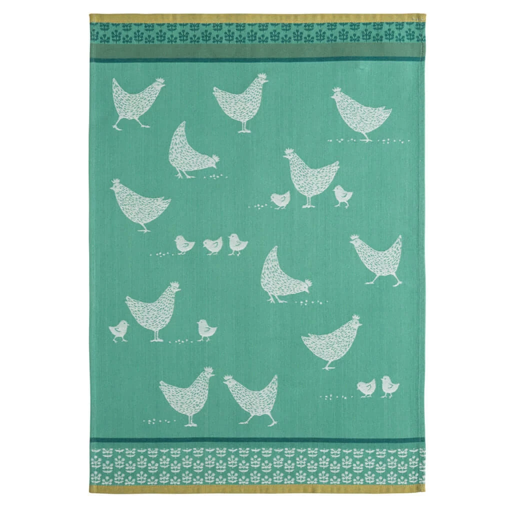 The Poulettes(Pullet Hens)jacquard dish towel fromCouckewill brighten your kitchen and your day. This green towel measures 20″ x 30″ and features a fun and detailed illustration woven into the towel of chickens and baby chicks.Beautiful and soft, this towel will serve you well.