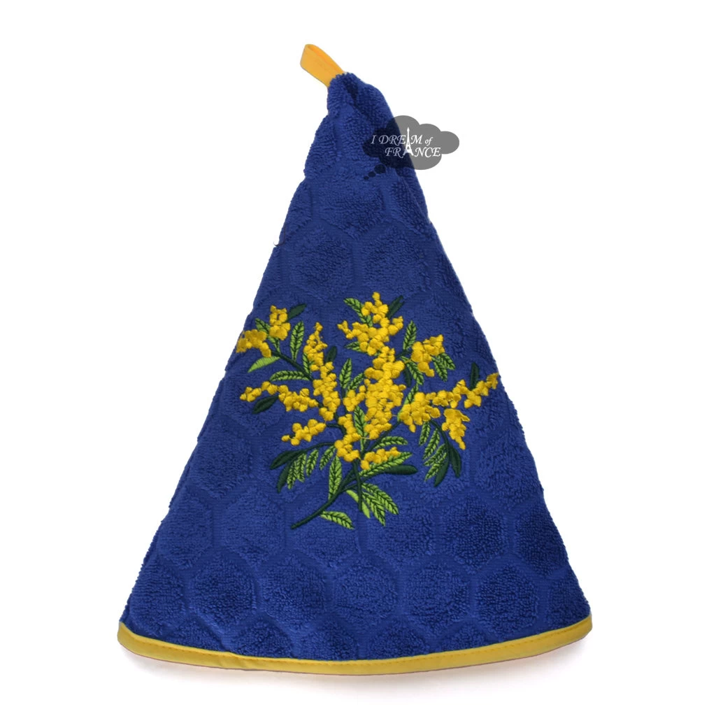 Direct from Provence, this hand towel is as beautiful as it is practical. In the kitchen or the bathroom, this round towel hangs from its center loop on the wall and offers a lot of surface area to dry your hands. This blue towel with yellow binding features a honeycomb terry pattern and is embroidered with a mimosa branch. Measures 26″ in diameter. Designed in France, Made in Turkey.