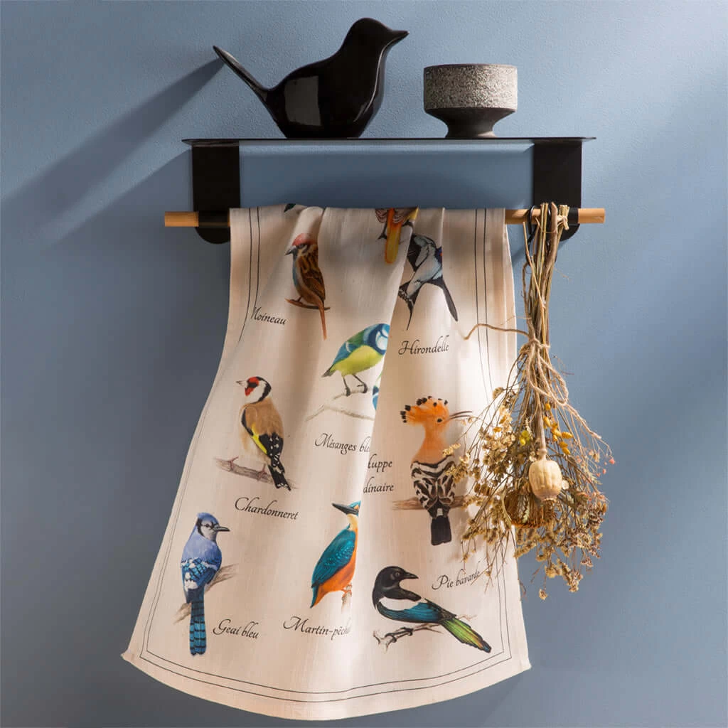 From Coucke, the Les Oiseaux(The Birds) linen blend dish towelis the perfect tool around the kitchen!This natural tone towel features aselection of birds and their French names. Made of 46% linen and 54% linen, this towel is as hard working as it is attractive. Can be washed on warm and last for many years.